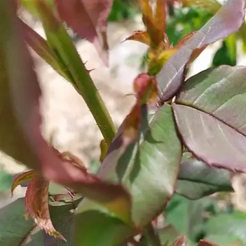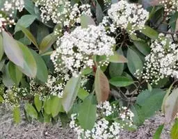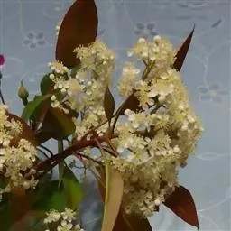 叶片为革质,且叶片表面的角质层非常厚。这也是叶片看起来非常光亮的原因。红叶石楠幼枝呈棕色,贴生短毛。后呈紫褐色.最后呈灰色无毛。树干及枝条上有刺。叶片长圆形至例卵状,披针形,长5-15厘米、宽2—5厘米,叶端渐尖而有短尖头,叶基楔形,叶缘有带腺的锯齿,叶柄长0.8-1.5厘米。花多而密,呈顶生复伞房花序。