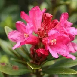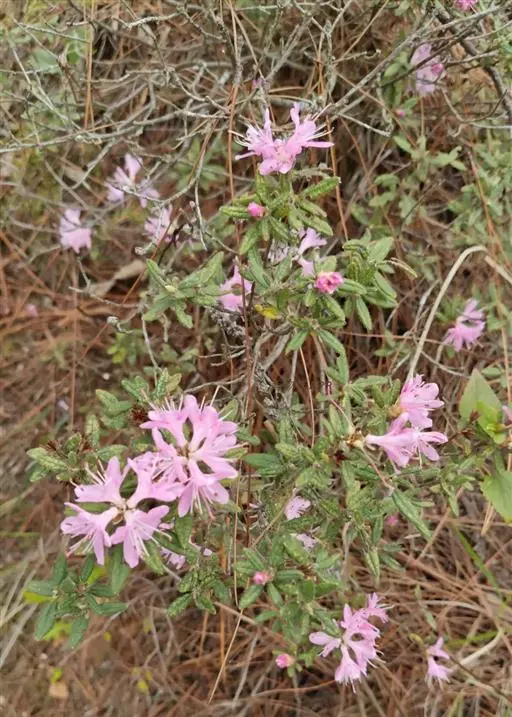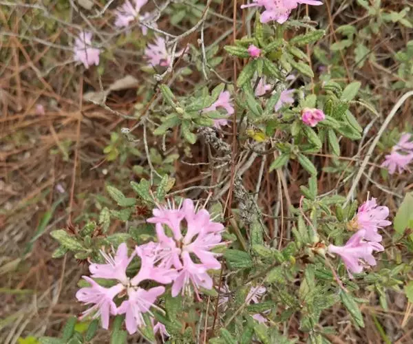 碎米花(学名:Rhododendron spiciferum Franch.):小灌木,高0.2--2米,多分枝,枝条细瘦。幼枝密被灰白色短柔毛和伸展的长硬长,以后渐脱落。叶散生枝上,叶片坚纸质,狭长圆形或长圆状披针形,上面深绿色,密被短柔毛和长硬毛,下面黄绿色,密被灰白色短柔毛。花芽数个,生枝顶叶腋,芽鳞外被灰白色绢毛并密生鳞片,边缘密被短纤毛,花开时仍不落;花序短总状,有花3-4朵;花冠漏斗状,长1.3-1.6厘米,粉红色,外面疏生腺鳞,于中部以上5裂。蒴果长圆形,被毛和鳞片。花期2-5月。