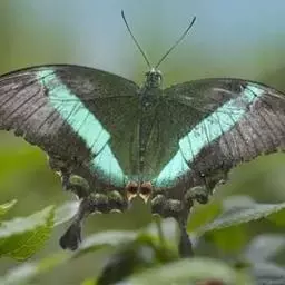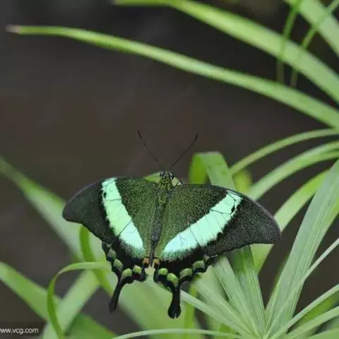 巴黎翠凤蝶中型凤蝶,躯体黑褐色,散布绿色亮鳞。后翅M3脉端有一明显叶状尾突。翅背面底色黑褐色,密布…