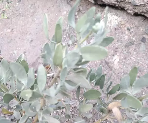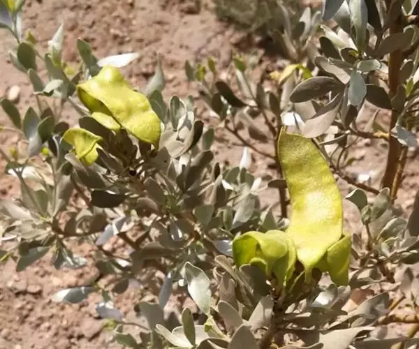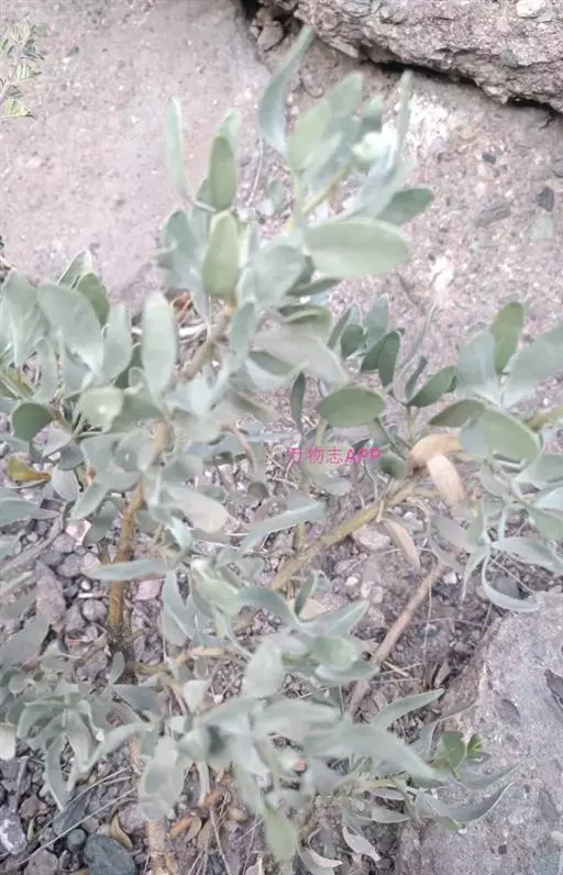 沙冬青 常绿灌木,高1.5-2米,粗壮;树皮黄绿色,木材褐色。茎多叉状分枝,圆柱形,具沟棱,幼被灰白色短柔毛,后渐稀疏。3小叶,偶为单叶;叶柄长5-15毫米,密被灰白色短柔毛;托叶小,三角形或三角状披针形,贴生叶柄,被银白色绒毛;小叶菱状椭圆形或阔披针形,长2-3.5厘米,宽6-20毫米,两面密被银白色绒毛,全缘,侧脉几不明显。