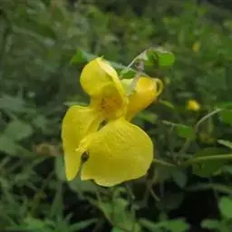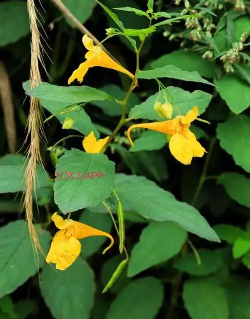 水金凤(学名:Impatiens noli-tangere Linn.):是凤仙花科,凤仙花属一年生草本植物,高可达70厘米。茎肉质,直立,叶互生;叶片卵形或卵状椭圆形,边缘有粗圆齿状齿,上面深绿色,下面灰绿色;叶柄纤细,总状花序;苞片草质,披针形,花黄色;侧生萼片卵形或宽卵形,旗瓣圆形或近圆形,翼瓣无柄,唇瓣宽漏斗状,花丝线形,花药卵球形,顶端尖;子房纺锤形,蒴果线状圆柱形,种子多数,7-9月开花。