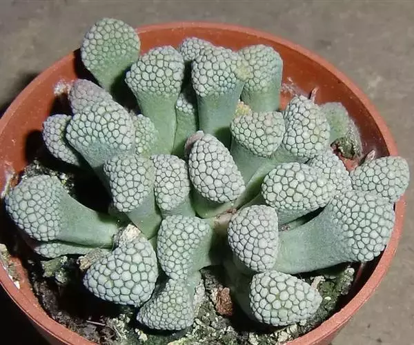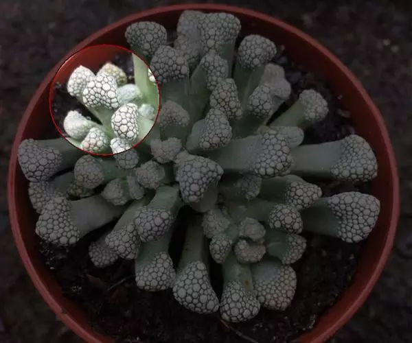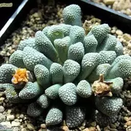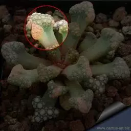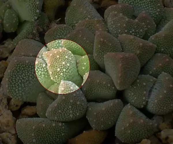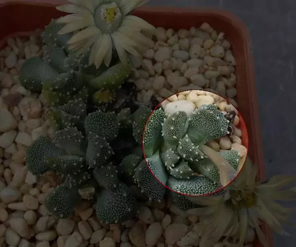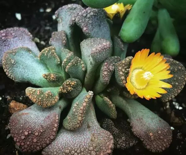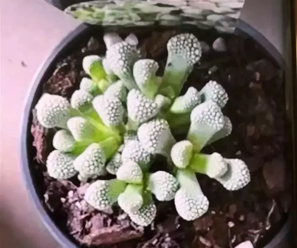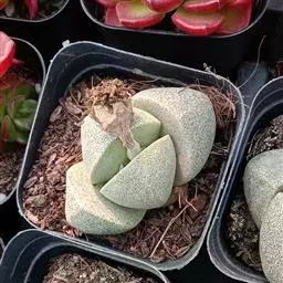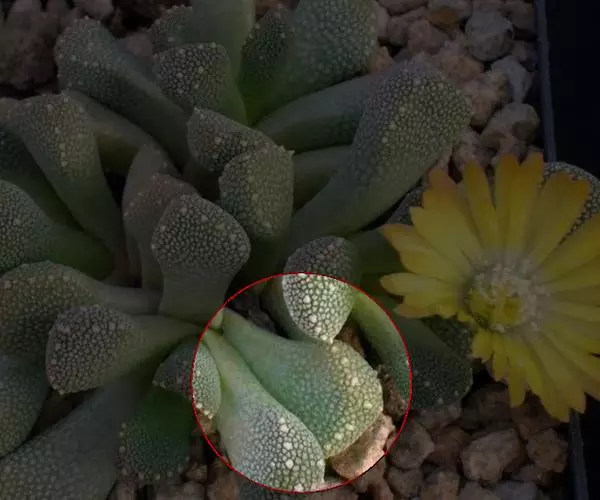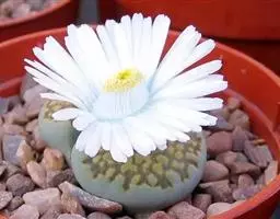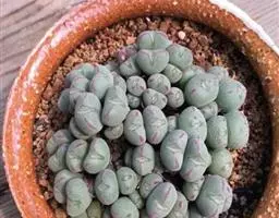 荒玉为番杏科生石花属,原产南非。株体呈白粉色,表面布满凹凸纹路,凹陷处为红褐色,每年秋季开黄花。