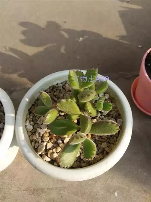 植株矮小,株高一般5~6厘米。叶片互生,长圆形或匙状,肉质肥厚,生于极短的茎上,紧密排列为莲座状,叶色翠绿色,叶肉呈半透明状,叶面有8~12条暗褐色条纹或中间有褐色、青色的斑块,叶缘粉红色,有细锯齿。顶生总状花序,花极小。是常见的多肉植物之一。