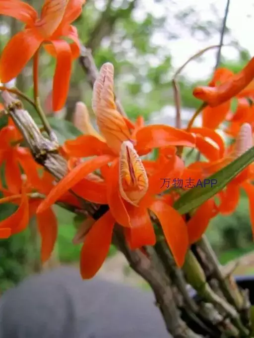 种名意思是“特别的、独特的”,指的是它的唇瓣,其唇瓣反转似犀牛角,布有深橙红色网纹,非常独特。这是个非常吸引人的小型种,目前已成为mini春石斛兰与非典型春石斛兰的重要亲本,虽然它没有饱满圆整的花型,但是花瓣橙红色与唇瓣上筋状网脉的遗传使得它异军突起,逐渐受到追捧。分布于越南、老挝、缅甸和泰国(海拔800-1550m),生长于低地森林的岩石和小灌木上。花期春季至初夏,花朵寿命长,可达1个月以上。