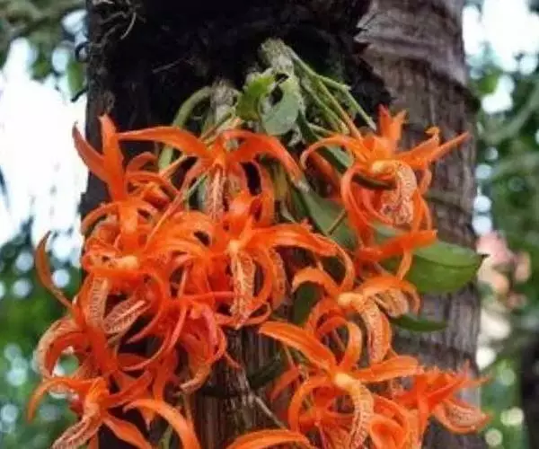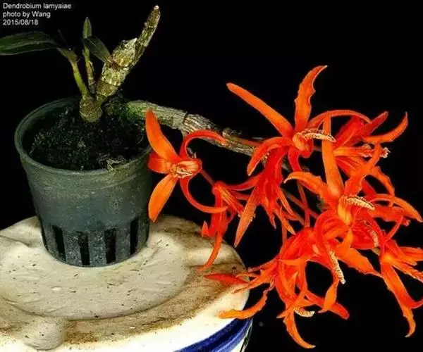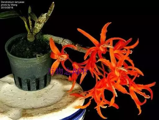 其唇瓣反转似犀牛角,布有深橙红色网纹,非常独特。这是个非常吸引人的小型种,目前已成为mini春石斛兰与非典型春石斛兰的重要亲本,虽然它没有饱满圆整的花型,但是花瓣橙红色与唇瓣上筋状网脉的遗传使得它异军突起,逐渐受到追捧。