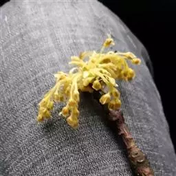 花序生于新枝中、下部,被毛,长3-7(10)厘米,通常3-4个,为紧缩不开展的圆锥花序,最下部分枝长2-2.5厘米;花被片卵形,长约4毫米,宽约3毫米,两面被短柔毛;第一,二轮花丝疏被柔毛,第三轮密被长柔毛,基部的腺体近无柄,退化雄蕊三角形,具柄,有长柔毛;子房近球形,与花柱无毛,或上半部与花柱疏被柔毛,柱头帽状。