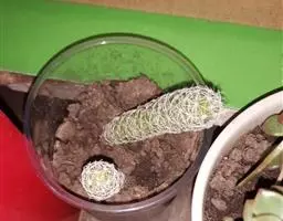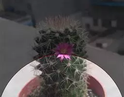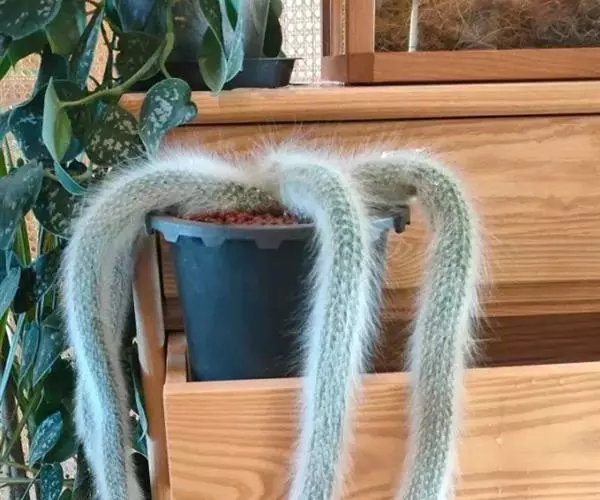 猴尾柱长长的尾巴 多年生的长柱状垂挂型肉质植物。刺软质,色白,如同厚厚的动物绒毛。外形与黄金纽酷似,但是黄金纽刺为黄色,且更短,更硬质。花为玫红色,花瓣边缘泛白色,且易开花,栽培得当整个夏天可以持续开花,花形与仙人指的花相似,但是猴尾柱得花要更大。它的果实隐藏在软刺之中,起到了保护作用。