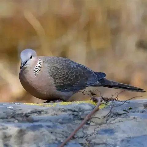 山斑鸠,是鸽形目鸽鸠科斑鸠属鸟类,又名金背斑鸠、棕背斑鸠、山鸠、金背鸠、麒麟斑、麒麟鸠、东方斑鸠、绿斑鸠、山鸽子。山斑鸠颈侧具明显黑白色条纹的块状斑,上体深褐色、具扇贝状斑纹,羽缘棕色,尾羽近黑色,下体多偏粉色。虹膜黄色,喙灰色,脚粉色。山斑鸠是留鸟,在中国常见且分布广泛。此外,还分布于不丹、尼泊尔、巴基斯坦、印度、日本等国。栖息于针阔混交林、季风常绿阔叶林、果园及农耕区,多成对活动于开阔农耕区、村舍、寺院周围及防火林带。取食于地面,主要觅食植物种子、果实、嫩芽等,也吃昆虫。山斑鸠飞翔时鼓翼快速,叫声为反复而低沉的“咕咕咕”声。繁殖期在4-7月,营巢于林中树上,通常一年繁殖2窝,窝卵数2枚,由雌雄亲鸟轮流孵卵,孵化期18~19天。山斑鸠的肉、卵可食,肉入药可益气明目、强筋壮骨,治久病气虚、衰弱无力、两目昏暗等病症。山斑鸠啄食杂草种子,对农田清除杂草有益;但有时也刨食农作物及树的种子。山斑鸠