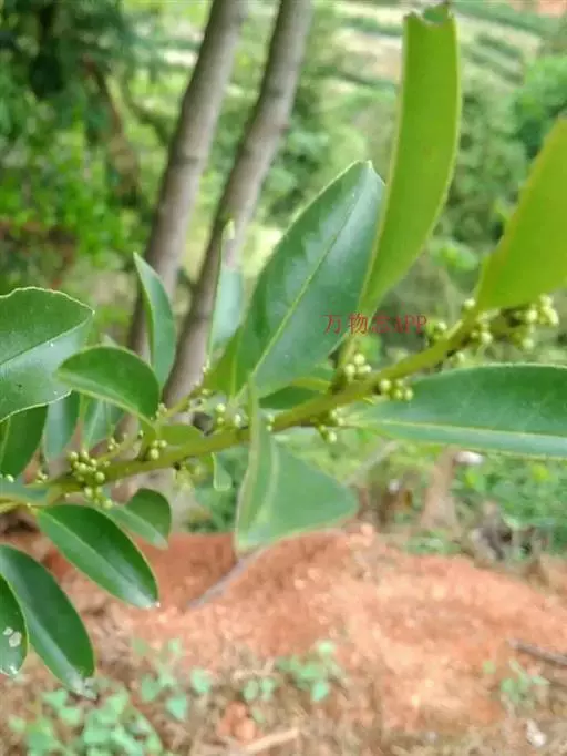 常绿灌木或乔木,高2~10米;幼枝近四棱形,稀近圆形,具纵棱及沟,密被短柔毛,具稍凸起的半圆形叶痕,皮孔无。叶生于1~3年生的枝上,叶片近革质,椭圆形,长圆形或卵状椭圆形,长2.5~10厘米,宽1.5~4厘米,先端急尖至渐尖,渐尖头长3~4毫米,基部圆形或钝,边缘具近波状线齿,叶面深绿色,干时呈褐色或橄榄绿色,幼时被微柔毛,后变无毛或近无毛,背面具腺点,疏被短柔毛,主脉在叶面凹陷,背面隆起,两面沿脉毛较密,侧脉7~10对,两面略明显或不明显,网状脉两面不明显;叶柄长3~5毫米,密被短柔毛,具叶片下延而成的狭翅。雄花1~3朵排成聚伞花序,1~5聚伞花序簇生于当年生或二三年生枝的叶腋内,花序梗长约2毫米,花梗长2~3毫米,两者均被短柔毛,基部或近中部具小苞片1~2枚;花4基数,白色或淡红色;花萼盘状,直径约3毫米,被微柔毛,4深裂,裂片近圆形,具缘毛;花冠直径约5毫米,花瓣阔卵形,基部稍合生;雄蕊短于花瓣,花药椭圆形,黄色;退化子房金字塔形,顶端具短喙,分裂。雌花1~5朵簇生于当年生或二年生枝的叶腋内,总花梗几无,花梗粗壮,长4~8(~14)毫米,被微柔毛,中部或近中部具2枚卵形小苞片;花萼同雄花;花瓣阔卵形至近圆形,基部稍合生;退化雄蕊长约为花瓣的1/3,不育花药心状箭形;子房卵球形,直径约1.5毫米,柱头厚盘状,4浅裂;果球形,直径6~7毫米,成熟后黑色;果梗长13~18毫米,被微柔毛或近无毛;宿存花萼伸展,直径约4毫米,具疏缘毛;宿存柱头厚盘状;分核4,卵状椭圆形,长约6毫米,背部宽约4毫米,平滑,背部具3条纹,无沟,内果皮革质。花期5~7月,果期8~11月。