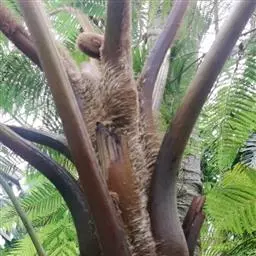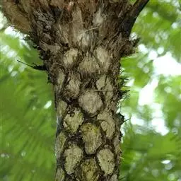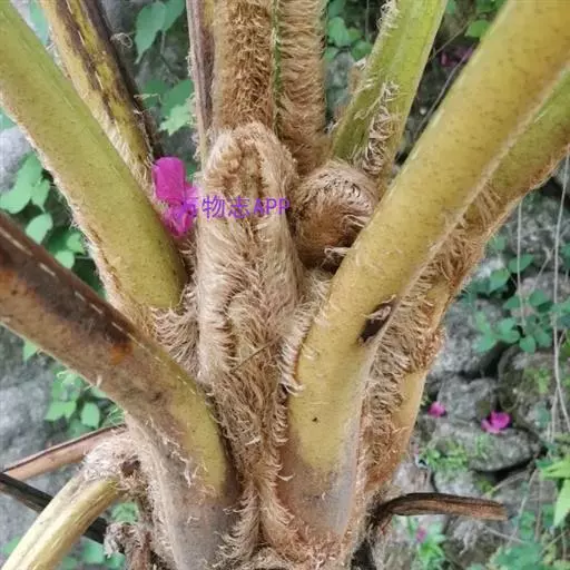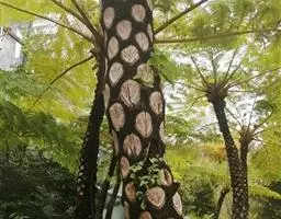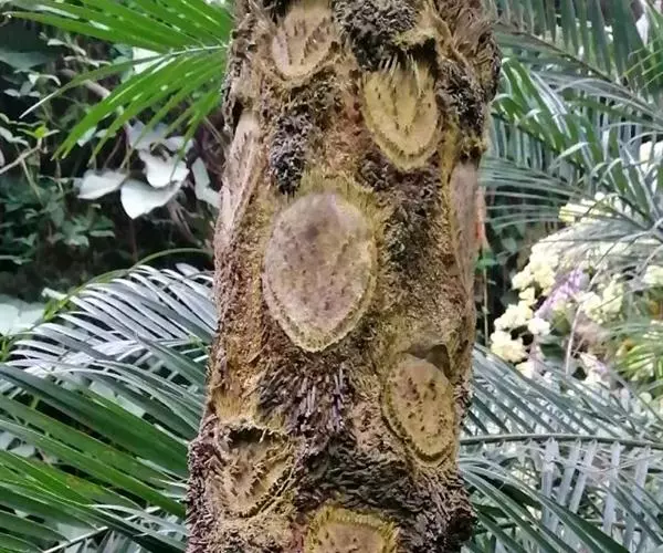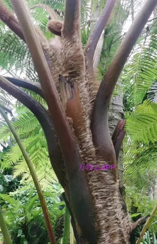 笔筒树的老叶脱落后,会在茎干上留下一个个略呈三角形的椭圆形叶痕,树干截面多为椭圆形,叶柄如蛇形,整个树干看起来就像是蛇一般,所以又有“蛇木”这个称号。