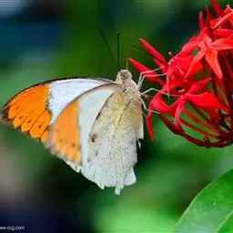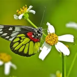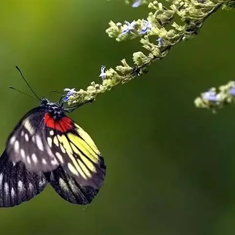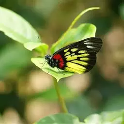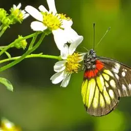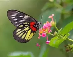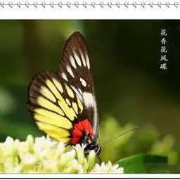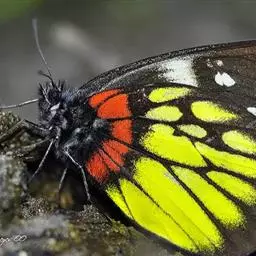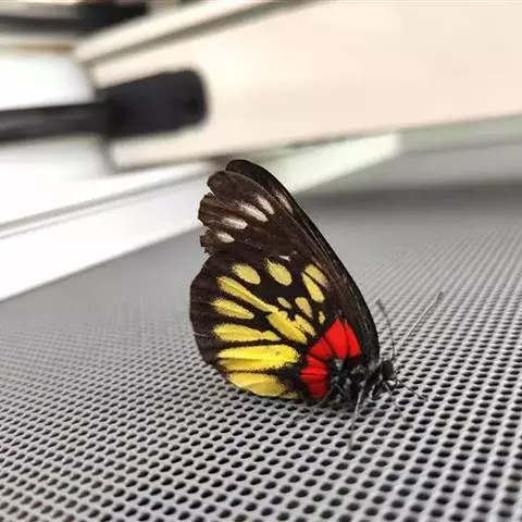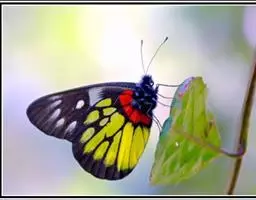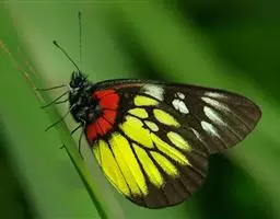 红肩粉蝶,Delias pasithoe curasena,属粉蝶科斑粉蝶属的一个物种。翅膀背面以黑褐色为主,只在翅面上有一些蓝白色小斑或鳞块,雄蝶并于后翅内缘附近有块鲜黄色区;腹面以黑褐色为底色,前翅上有明显的蓝白色斑纹,后翅则有许多鲜黄色斑块,而于翅基有血红色纹彩。