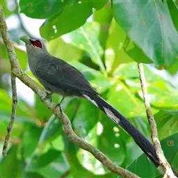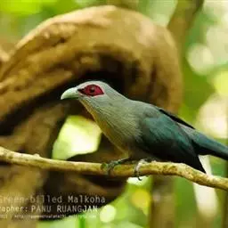 绿嘴地鹃:体形似小鸦鹃,但羽色大致绿灰;嘴绿色,头侧眼的周围有一裸区;后爪弯曲。虹膜赤红色,…