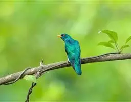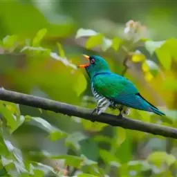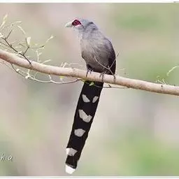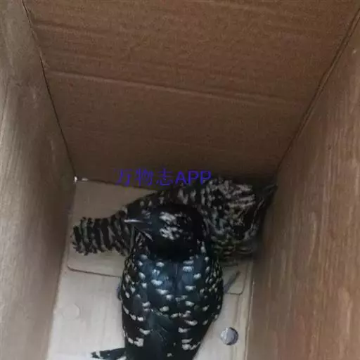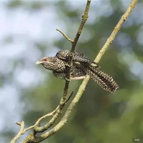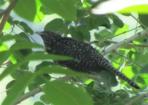 噪鹃(学名:Eudynamys scolopaceus):体长39-46厘米,约重350克。属中型鸟类。雄鸟通体黑色,具蓝色光泽,下体沾绿。雌鸟上体暗褐色,略具金属绿色光泽,并满布整齐的白色小斑点;头部白色斑点略沾皮黄色,且较细密,常呈纵纹状排列。背、翅上覆羽及飞羽,以及尾羽常呈横斑状排列。颏至上胸黑色,密被粗的白色斑点,其余下体白色,具黑色横斑。