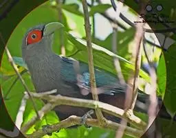 虹膜深红色,鸟喙白至土黄色或浅绿色,基部较灰暗。脚蓝灰。有点像乌鸦,又有点像斑鸠,比乌鸦和斑鸠都要大。