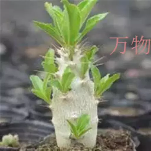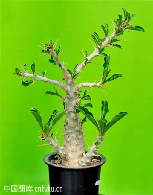 茎干类多肉美花美型种,植株块茎酒瓶状,株高1.5-2M,株幅1M。茎干基部膨大上粗下细,分枝棒状,表皮银白色。散生长刺,3刺一簇灰褐色。绿色叶4-8厘米长,3厘米宽,簇生茎端似伞状。略有短毛。花高脚碟状,白色或淡红色,花瓣中间夹有红条纹。花期夏季。