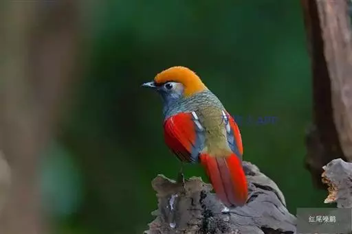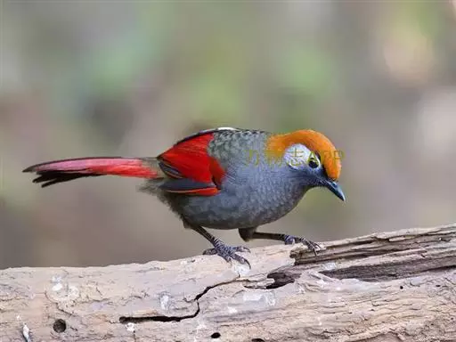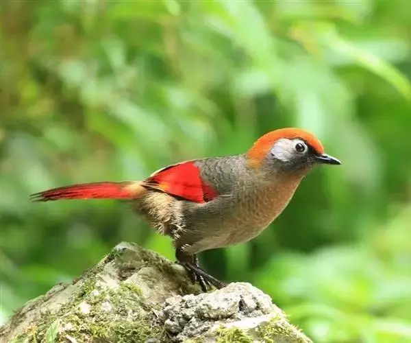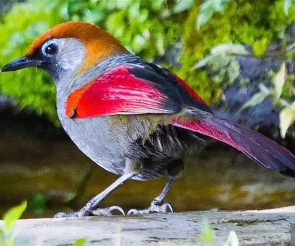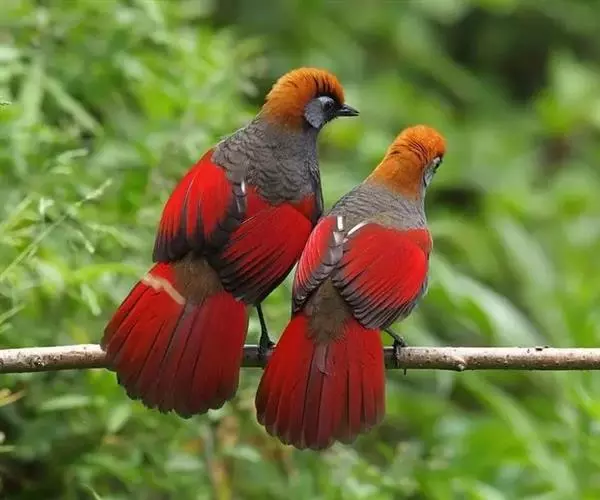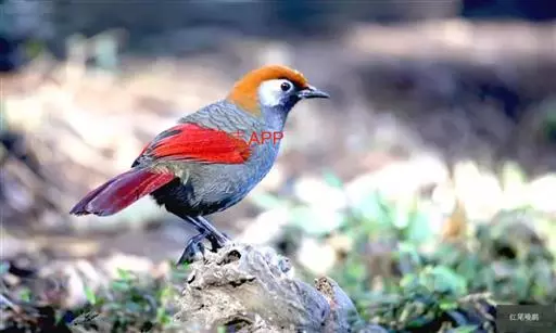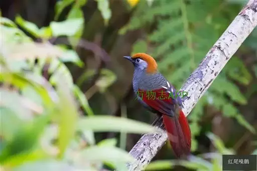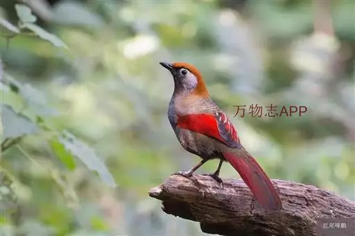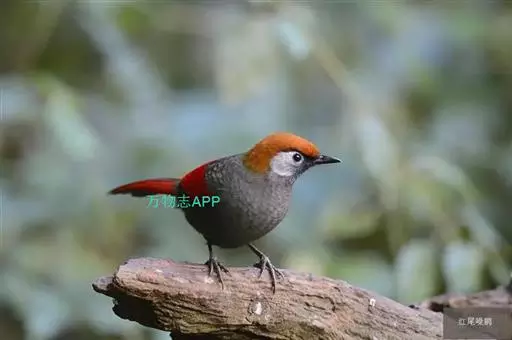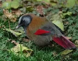 赤尾噪鹛(学名:Garrulax milnei)中型鸟类,体长24~28厘米。头顶至后颈红棕色,两翅和尾鲜红色,眼先、眉纹、颊、颏和喉黑色,眼后有一灰色块斑。其余上下体羽大都暗灰或橄榄灰色。特征极明显,特别是通过鲜红色的头顶、翅和尾。