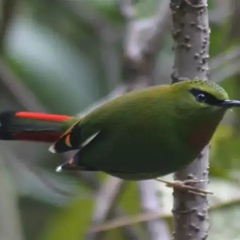 喜作喧闹的舞蹈炫耀表演,尾抽动并扑打绯红色的两翼。结群栖于常绿林的稠密林下植被及竹丛中。叫声响亮刺耳,群鸟发出叽喳声。