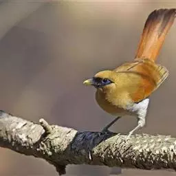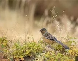大噪鹛:中型鸟类,体长32-36厘米。额至头顶黑褐色,背栗褐色满杂以白色斑点,…
