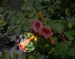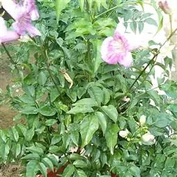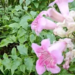 粉花凌霄 K.Schum.)是紫葳科魔盒凌霄属的落叶藤本植物。奇数羽状复叶对生,小叶全缘,…