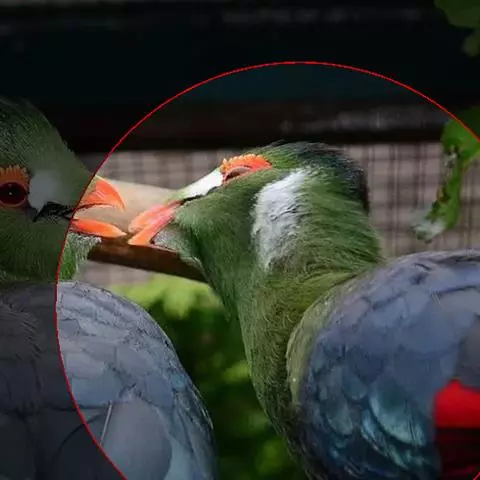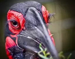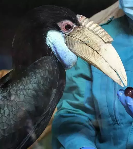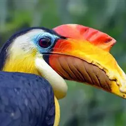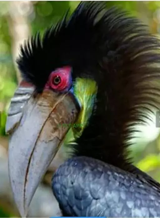 虹膜雄鸟橙红色至血红色,眼周裸露皮肤暗红至砖红色。雌鸟虹膜褐色或灰褐色。嘴象牙黄色,基部缀暗橙红色,雌鸟嘴亦为黄色。嘴缘有细锯齿状缺刻,上嘴基部有一较扁平的盔突,其上有6道皱褶隆起,形成“皱盔”。嘴基两侧各具数道斜形雕纹,脚绿色或石板黑色。