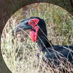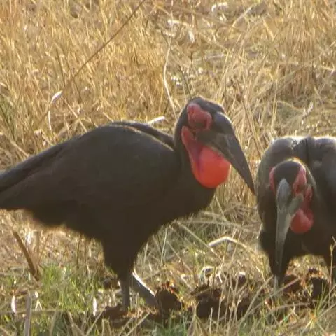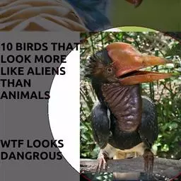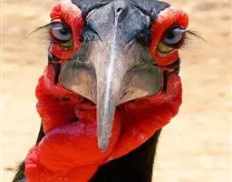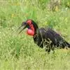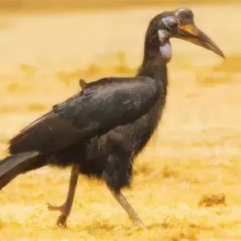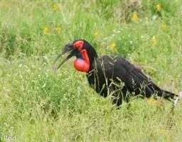 花冠皱盔犀鸟(学名:Rhyticeros undulatus)雄鸟体长约105厘米,雌鸟较小。尾白,雄雌两性的背、两翼及腹部均为黑色,但雄鸟头部奶白色,枕部具略红的丝状羽,裸出的喉囊上具明显的黑色条纹。雌鸟头颈黑,喉囊蓝色。