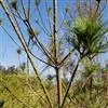病害 为黑松枝枯病。又名黑松枯梢病、垂枝病和软枝病,病原经鉴定为铁锈薄盘菌(Cenangium feruginosum Frex Fr),属子囊菌亚门,盘菌纲,柔膜菌目,薄盘菌属。该病菌是一种弱寄生菌,普遍潜伏在树体内,在树木正常生长的情况下,并不造成危害,一旦遭遇旱、涝、冻等气象灾害,导致树势衰弱时,枝枯病菌才能危害树体。因此,黑松枝叶发黄和枯死的直接原因是枝枯病,而气候异常是引起枝枯病大发生的主要诱因。在我国分布于东北、山东、河北、陕西、北京等地区,松树从苗木、幼树到成年树均可受害,轻者枝条枯死,重者全株死亡。至90年代初期,青岛市前海一线黑松枝枯病发病率高达98%,部分病树成片死亡。症状表现有多种形式,如顶芽枯死、枯叶、枯梢、根腐、软枝、生长不良等,发病严重时,即使是数10年生的大树全株亦无一健康的新梢。当小枝、侧枝或干部发病时,其上的针叶先变为黄绿,逐渐红褐色,当针叶变为红褐色时,被害枝干则明显表现出因失水而病皮收缩起皱的病状,针叶逐渐脱落、叶痕处稍膨大。病害若发生在小枝上,小枝则干枯死亡。主干皮部发病时,开始有轻微的流脂现象,随后流脂加剧,病皮亦逐渐干缩下陷。