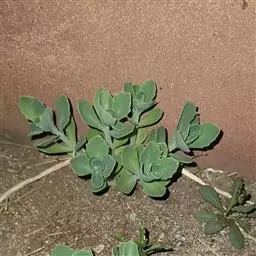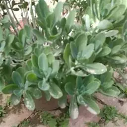 叶肉质肥厚,紫灰色,倒卵形,匙形或椭圆形,宽2.5-3.5厘米,长0.5-1.5厘米,叶尖尖锐,基部渐短粗,全缘,无毛,具白粉。