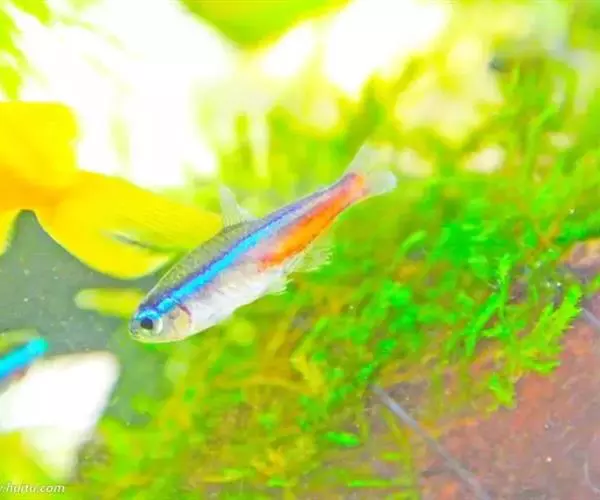 霓虹灯鱼又被称为红绿灯鱼、红莲灯鱼。鱼纲,脂鲤科(拟鲤科)。原产亚马孙河上游。体长3~4厘米,体形较细,色泽美丽,体上部的绿线,因光线角度不同,有时显出蓝色,与体下部的红线极为协调(后腹部至尾鳍基部为红色),又与腹部全红的新红绿灯鱼〔新红莲灯鱼;(Paracheirodon simulans)〕有明显差异。鱼性胆小,常在水上安静的环境下游动。喜食活水蚤,极易饲养。