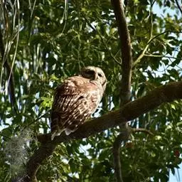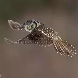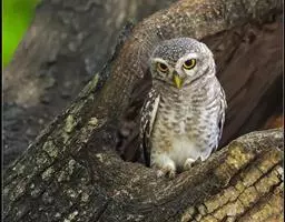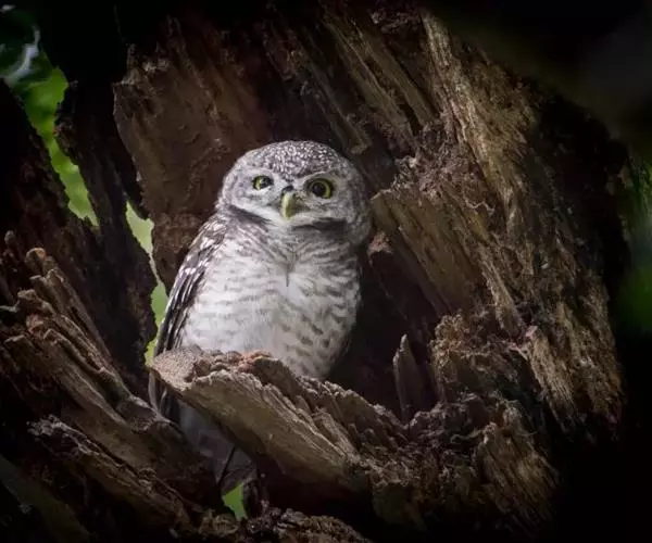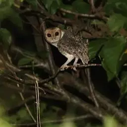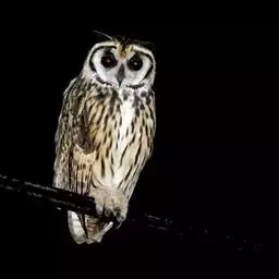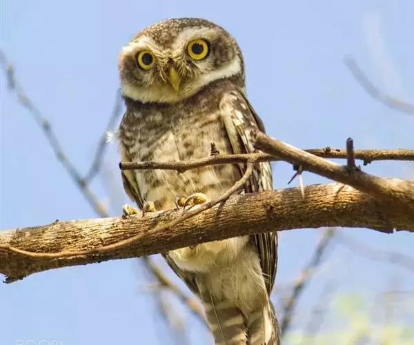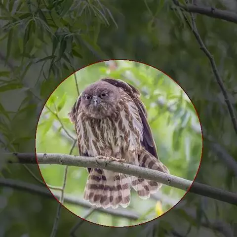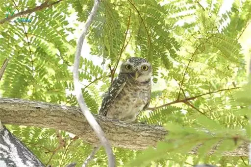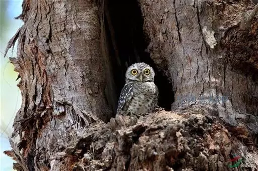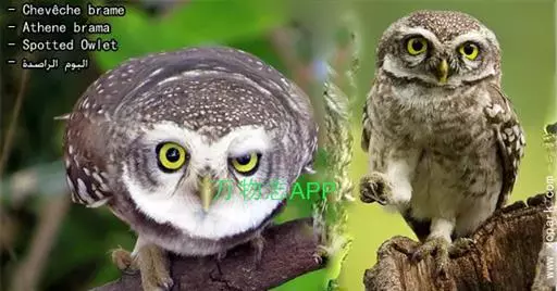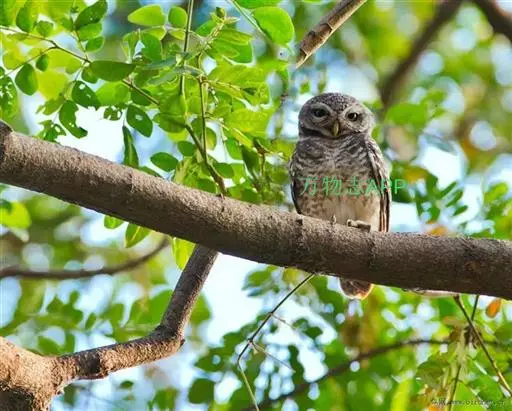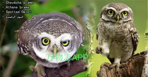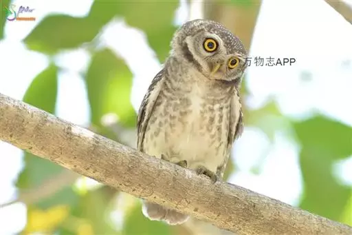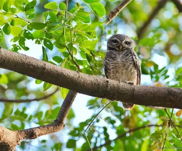 横斑腹小鸮(Athene brama):是鸱鸮科、小鸮属的一种鸟类。体长20厘米左右。面盘不明显,没有耳羽簇,皱领也不显著。跗蹠和趾被羽。上体为灰褐色至棕褐色,具白色斑点,尤以头顶较为细密,眉纹和两眼之间为白色,后颈具不完整的白色翎领。下体为灰色,没有条纹,两胁具横斑,所以得名,但腹的中部为纯白色,没有斑。虹膜金黄色。嘴角绿色,嘴峰有时较暗,有时较黄,蜡膜绿色或绿褐色,脚黄绿色,铅绿色或暗黄色。