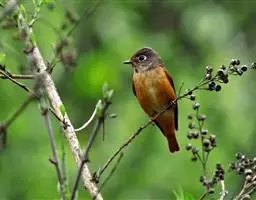 赭红尾鸲:小型鸟类,体长13-16厘米。雄鸟前额、头侧、颈侧、颏至胸概黑色,头顶和背灰色或黑色,…