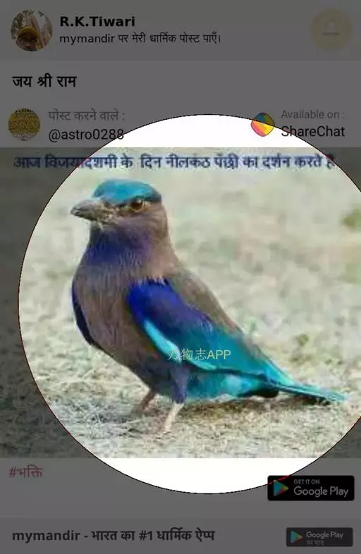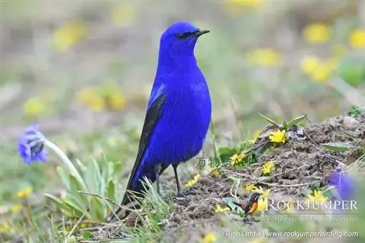 蓝大翅鸲(学名:Grandala coelicolor)是鹟科、大翅鸲属小型鸟类,体长19-21厘米。两翅尖长。雄鸟通体鲜紫蓝色具金属光泽。两翅和尾黑色。雌鸟上体灰褐色,头、颈、翕具棕白色纵纹,翅上有白色翅斑。虹膜暗褐色,嘴、脚黑色。