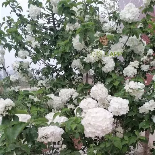 绣球荚蒾 落叶或半常绿灌木,高达4米;树皮灰褐色或灰白色;芽、幼技、叶柄及花序均密被灰白色或黄白色簇状短毛,后渐变无毛。