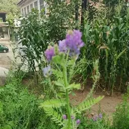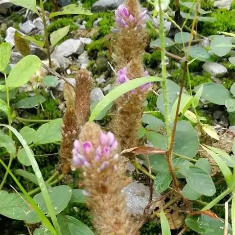总状花序长15-30厘米,中部以上有颇密集的花;苞片线状披针形至线形,远比小苞片长,早落;小苞片卵形,长不及2毫米;花2-3朵聚生于花序轴的节上;花萼钟形,长8-10毫米,被黄褐色柔毛,裂片披针形,渐尖,比萼管略长;花冠长10-12毫米,紫色,旗瓣倒卵形,基部有2耳及一黄色硬痂状附属体,具短瓣柄,翼瓣镰状,较龙骨瓣为狭,基部有线形、向下的耳,龙骨瓣镰状长圆形,基部有极小、急尖的耳;对旗瓣的1枚雄蕊仅上部离生;子房线形,被毛。