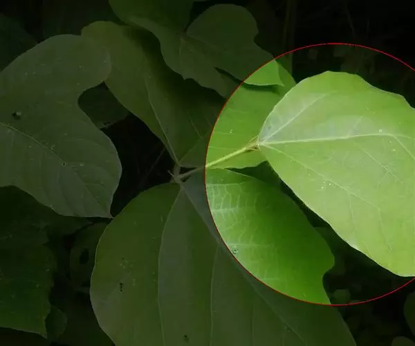 羽状复叶具3小叶;托叶背着,卵状长圆形,具线条;小托叶线状披针形,与小叶柄等长或较长;小叶三裂,偶尔全缘,顶生小叶宽卵形或斜卵形,长7-15(-19)厘米,宽5-12(-18)厘米,先端长渐尖,侧生小叶斜卵形,稍小,上面被淡黄色、平伏的蔬柔毛。下面较密;小叶柄被黄褐色绒毛。