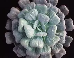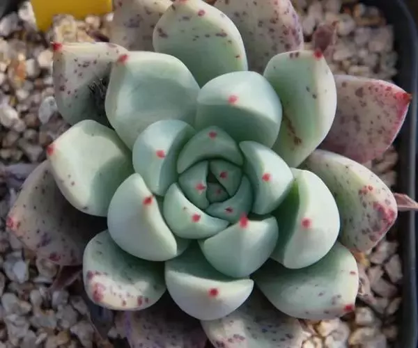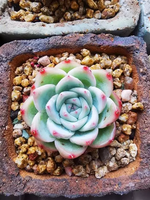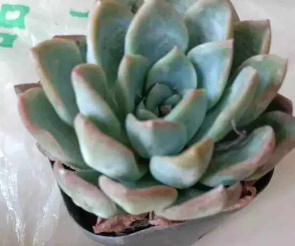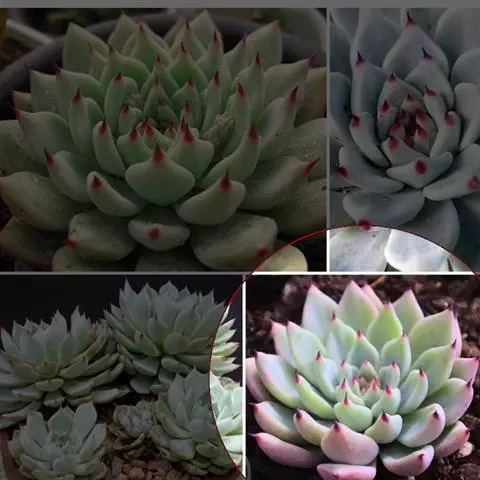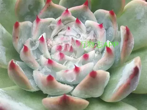 蓝绿至灰绿、淡绿色,并被有浓厚的白粉,日照充足时顶端的小尖呈美丽的玫瑰红或深粉红色。