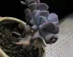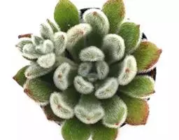 植株小型,无茎的莲座叶盘非常紧凑。卵形叶较厚,带小尖,长4厘米、宽2厘米。