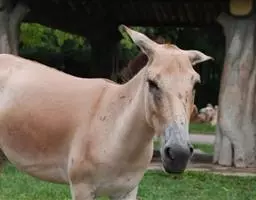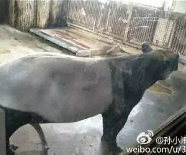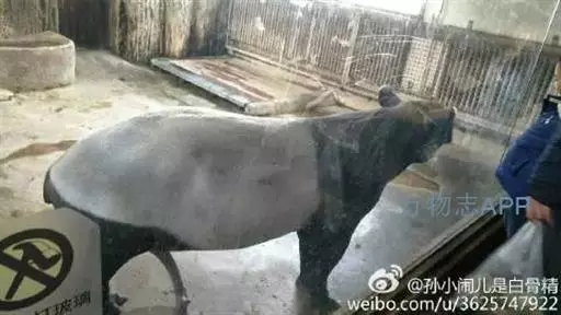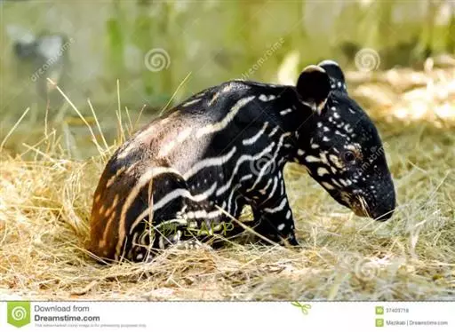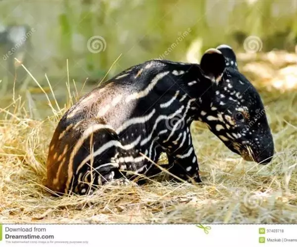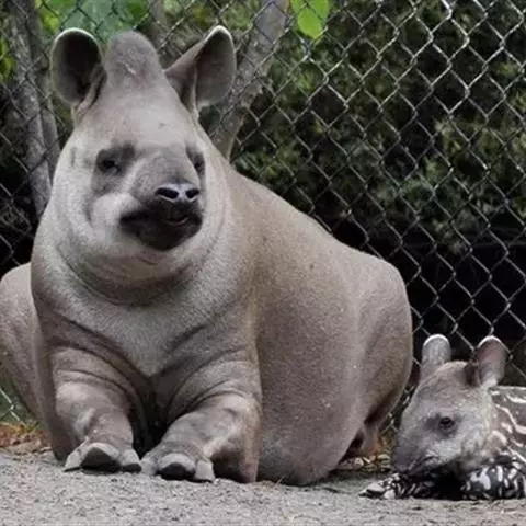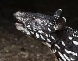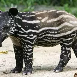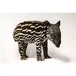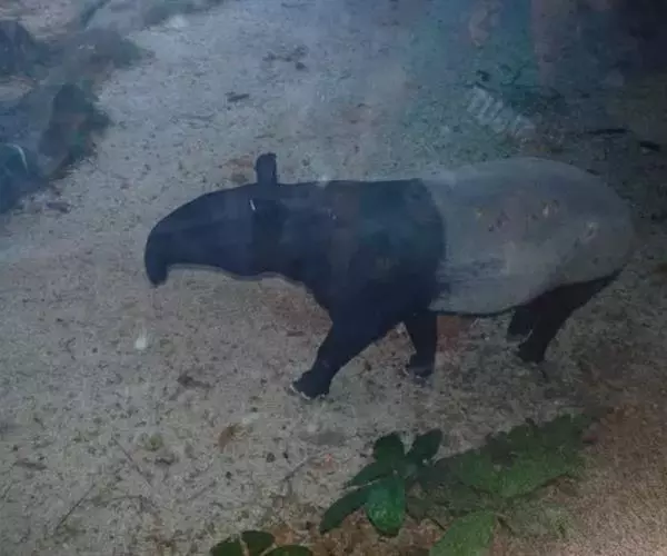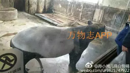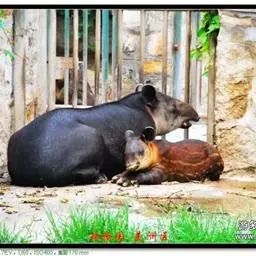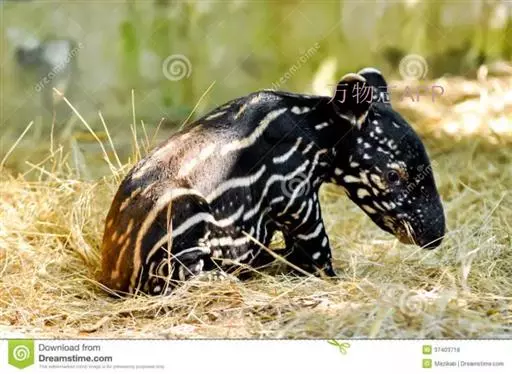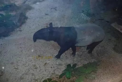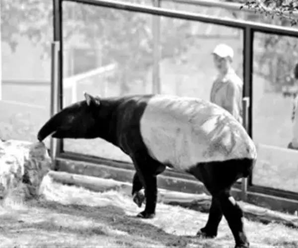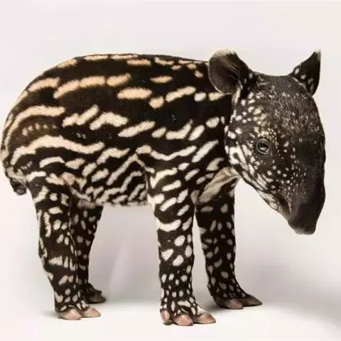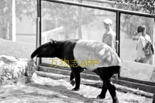 亚洲貘(学名:Tapirus indicus):亦称马来貘,是貘类中最大的一种,体长为1.8-2.5米,肩高90-120厘米,尾长5-10厘米,体重250-540千克。又叫五不像,它的鼻似象,耳似犀,尾似牛,足似虎,躯似熊,全身毛色黑白相间。长相十分奇特而有趣,一副呆头呆脑的样子,身体滚圆而肥壮,皮肤很厚,头部比猪大得多,脖子粗壮,鼻吻部延长、突出呈圆筒形,柔软而下垂,雌性比雄性大一点