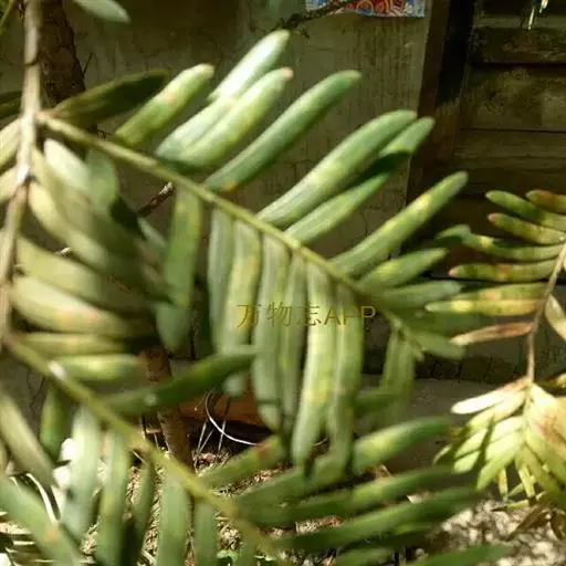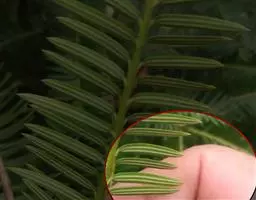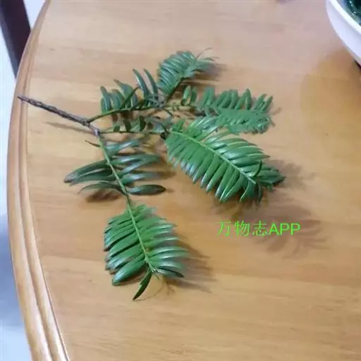 叶排列成两列,条形,微弯或较直,长1-3(多为1.5-2.2)厘米,宽2-4(多为3)毫米,上部微渐窄,先端常微急尖,稀急尖或渐尖,上面深绿色,有光泽,下面淡黄绿色,有两条气孔带,中脉带上有密生均匀而微小的圆形角质乳头状突起点,常与气孔带同色,稀色较浅。