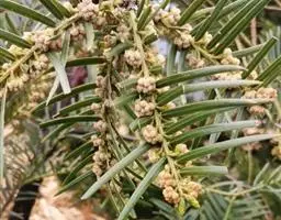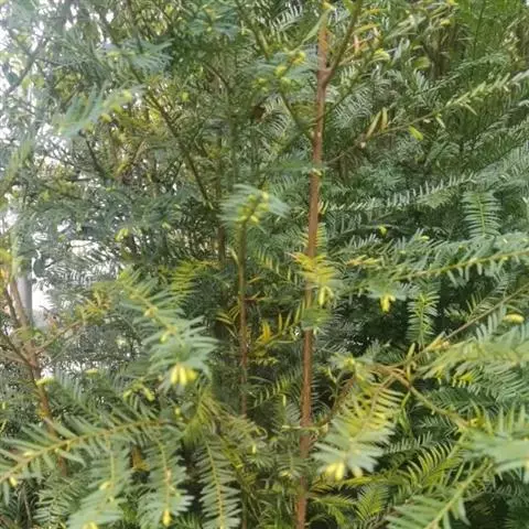 雄球花淡黄色,雄蕊8-14枚,花药4-8(多为5-6)。种子生于杯状红色肉质的假种皮中,间或生于近膜质盘状的种托(即未发育成肉质假种皮的珠托)之上,常呈卵圆形,上部渐窄,稀倒卵状,长5-7毫米,径3.5-5毫米,微扁或圆,上部常具二钝棱脊,稀上部三角状具三条钝脊,先端有突起的短钝尖头,种脐近圆形或宽椭圆形,稀三角状圆形。