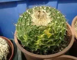 江守玉为仙人掌科强刺球属,植株扁圆形至球形,后成圆柱状,体色灰绿,刺座上附生白色绒毛,花橙黄色,漏…