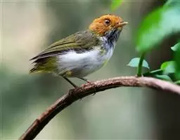 棕脸鹟莺:体长10厘米,是一种色彩亮丽而有特色的莺鸟。头栗色,具黑色侧冠纹。上体绿,腰黄色。下体白,…