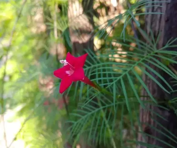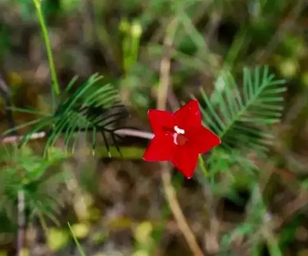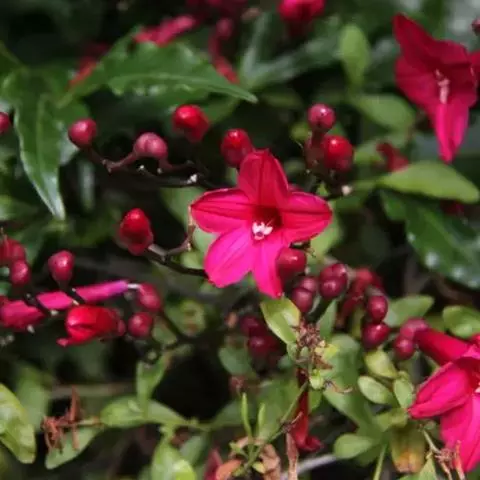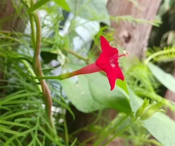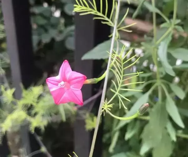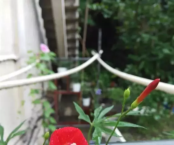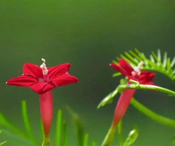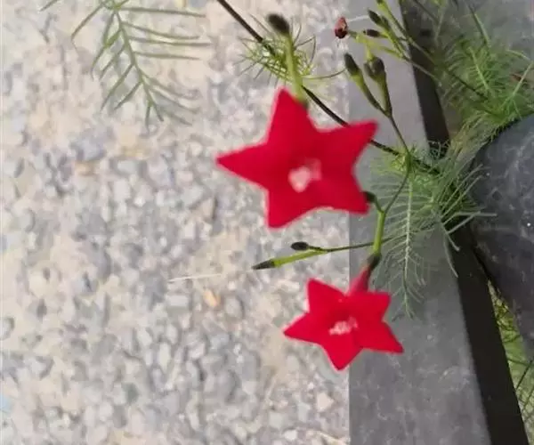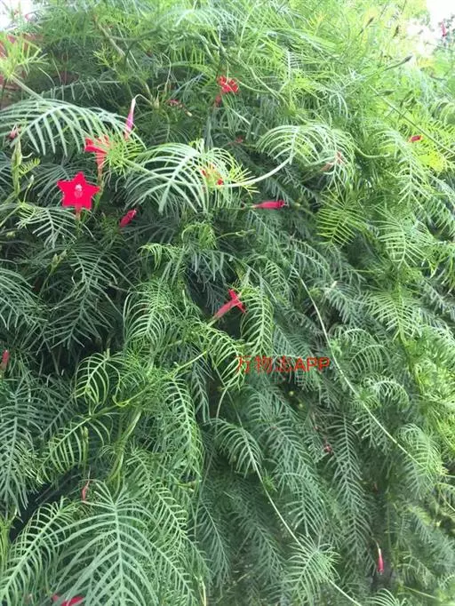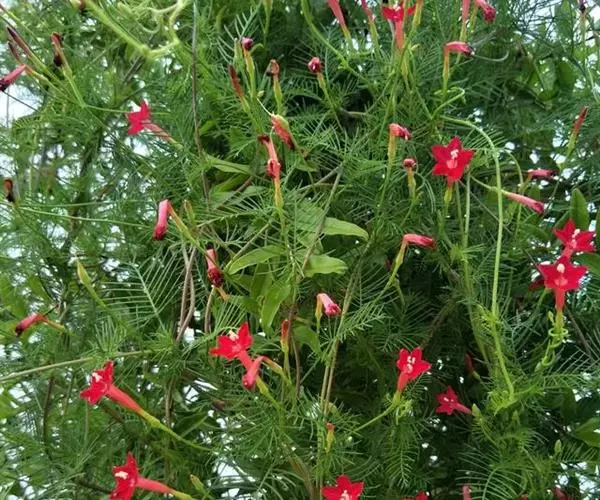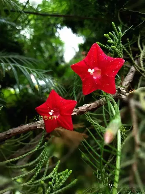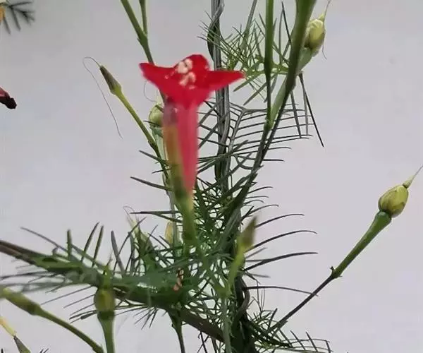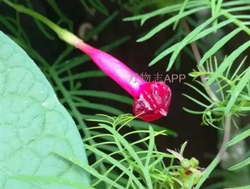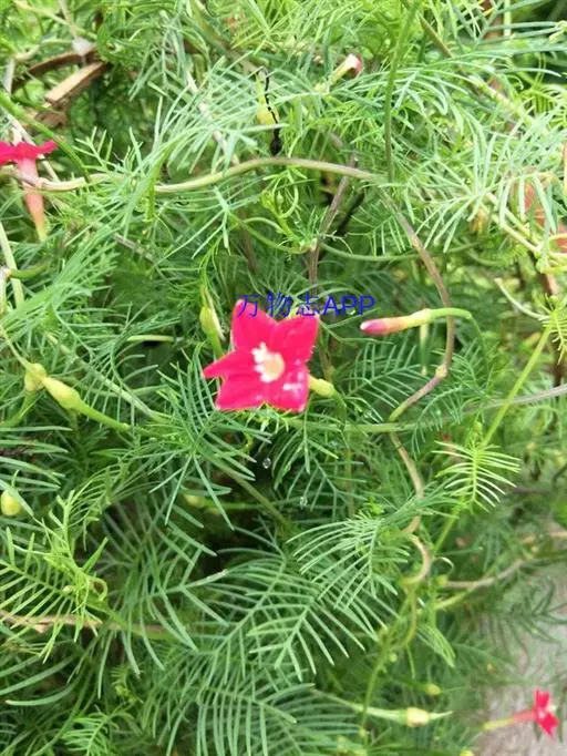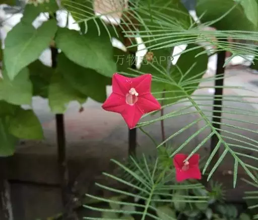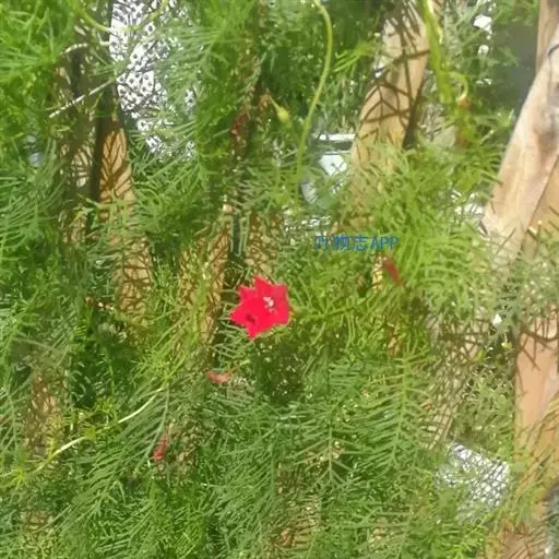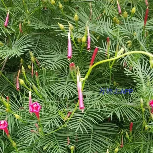 1年生草质藤本植物。茎细长柔软光滑。叶羽状细裂,茂密细腻。小花高脚碟形,花色鲜红、深红或白色,点点铺撒在绿色叶丛中,清丽诱人,花期7—10月。果成熟黑色,易脱落,应及时采收。