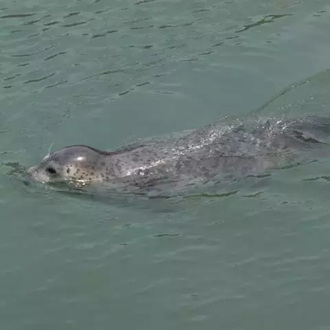 斑海豹的身体肥壮而浑圆,呈纺锤型,体长约1.2~2米,体重约100公斤,全身生有细密的短毛,背部灰黑色 水中的斑海豹 并布有不规则的棕灰色或棕黑色的斑点,腹面乳白色,斑点稀少,雄兽略大于雌兽。头圆而平滑,眼大,吻短而宽,唇部触口须长而硬,呈念珠状,感觉灵敏,是它觅食的武器之一。没有外耳廓,也没有明显的颈部,四肢短,前后肢都有五趾(指),趾间有皮膜相连,似蹼状,形成鳍足,指、趾端部具有尖锐的爪。前肢狭小,后肢较大而呈扇形,其趾外侧长而内侧短,尾短小,仅有7~10厘米长,夹于后肢之间,联成扇形。前肢朝前,后肢朝后,不能弯曲,游泳的姿势就像人伸开手脚俯卧的样子,这种体型十分适宜在大海中游泳。