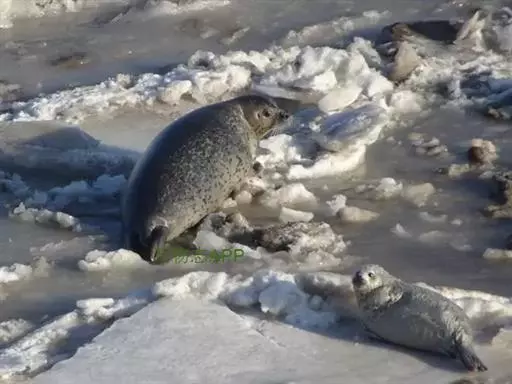 斑海豹 斑海豹发情时精神非常旺盛,在水中不停地游动,但食量减少或拒食,雄兽的阴茎外露,雌兽的阴门红肿。它们在水中相互追逐,时而上岸,时而入水,并发生阵阵叫声。交配需要沉入深水中进行,此时雌兽不动,雄兽的后鳍摆动,交配后双双回到水面上。雌兽的怀孕期约为8~10个月,每年2月产仔,分娩时需要爬到岸边或冰块上,每胎只产1仔。但在产仔前,雌兽会在浮冰上挖掘出一个巢穴,产仔时躲在巢穴中,迅速产下的幼仔躲避危险的办法也是潜入海中,或者在栖息的浮冰上挖穿一个大洞,以便随时潜入水中逃走。幼仔初生时体重约为5~6公斤,全身披着白色的胎毛,被人们称作“白色的小海豹”。这种白色的胎毛在冰雪的环境中是一种保护色,使它们不易被天敌发现,但也因为能吸收大量水分,不利于它们在水中游泳。因此,幼仔在出生后的第16天后皮下脂肪渐渐形成时,就开始脱换胎毛。大约需要9天的时间,胎毛便全部脱换完毕,换成了短、粗、硬,光亮而有斑点的新毛。这种新毛不易淋湿,它们一爬上岸水就直往下淌,不会在皮肤上结冰。幼仔出生几分钟后就表现出一种本能的跟随性,它在尾随雌兽的时候几乎不停地发出叫声,这种声音显然是为了与雌兽保持联系,而且能够同时在空气和水传播,直到断奶后叫声才停止。雌兽也特别留意幼仔的行动,即使在水中也能仰头向后看。如果遇到紧急情况,雌兽会将身体一弹,腾空而起用肥胖身体的重力使浮冰砸破,然后同幼仔一起落水而逃。经过一个月左右的哺乳期,幼仔的体重增至20千克以后,就开始独立生活了。西太平洋斑海豹性成熟的年龄为3~5岁,也有2岁就达到性成熟的,性成熟后生长趋于缓慢,雄性15岁,雌性10岁后就不再增长。