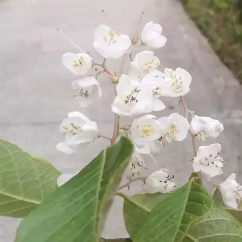 圆锥花序顶生或腋生,第二次分枝几成穗状,长10-15厘米;花序梗、花梗和花萼均密被黄色星状绒毛;花白色,长12-14毫米;花梗长约2毫米;苞片和小苞片早落;花萼钟状,高约2毫米,5脉,萼齿披针形,长约1毫米,顶端渐尖;花瓣长椭圆形或椭圆状匙形,长约6毫米,宽约2.5毫米,顶端钝或短尖;雄蕊10枚,近等长,伸出,花丝宽扁,两面均被疏柔毛,花药长圆形,稍弯,子房密被灰白色粗毛,柱头稍3裂。