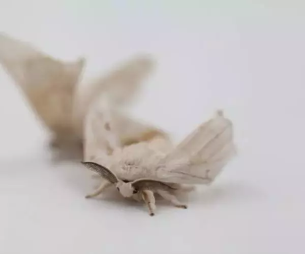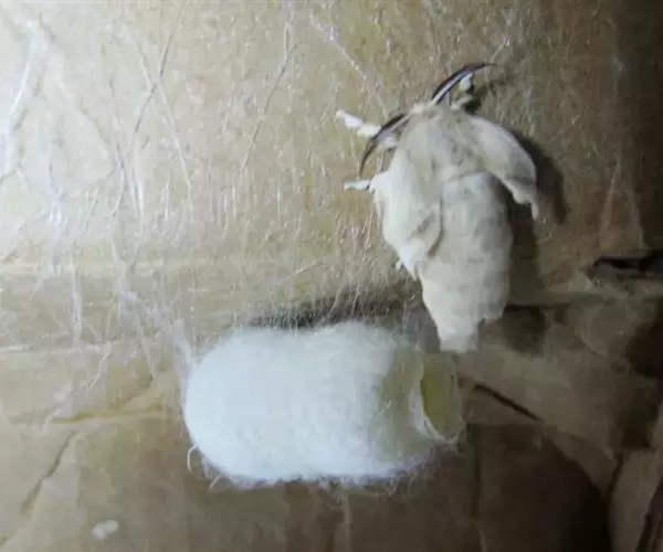 蚕蛾的形状像蝴蝶,全身披着白色鳞毛,但由于两对翅较小,已失去飞翔能力。蚕蛾的头部呈小球状,长有鼓起的复眼和触角;胸部长有一对胸足及两对翅;腹部已无腹足,末端体节演化为外生殖器。雌蛾体大,爬动慢;雄蛾体小,爬动较快,翅膀飞快地振动,寻找着配偶。一般交尾3~4小时后,雌蛾就可产下受精卵。蚕蛾(成虫)留下后代,不久之后便会死去。蚕蛾产下的卵→孵蚕→变蛹→化蛾,又将完成新一代的循环。这就是蚕的生命史。