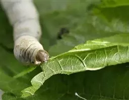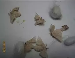 鳞翅目(Lepidoptera)蚕蛾科(Bombycidae)家蚕属(Bombyx) 蚕蛾 昆虫,驯养以取其丝。养蚕业历史悠久,原产于中国的家蚕已引到世界各地,并已驯化。成蛾翅展40~50公釐(约2吋),体粗壮多毛,寿命只2~3天,不取食,也很少飞行。产卵约300~500粒。幼虫(蚕)白色,无毛,具特征性的尾棘;主要以桑叶为食,有时亦食桑橙或莴苣的叶;生长45天後最长可达75公釐(约3吋)。幼虫成熟後吐出一条连续的长约915公尺(1,000码)的丝,结成一茧,在其中化蛹。为取用其丝,人们用热空气或蒸汽杀死其蛹,并保持其丝的完整性。
