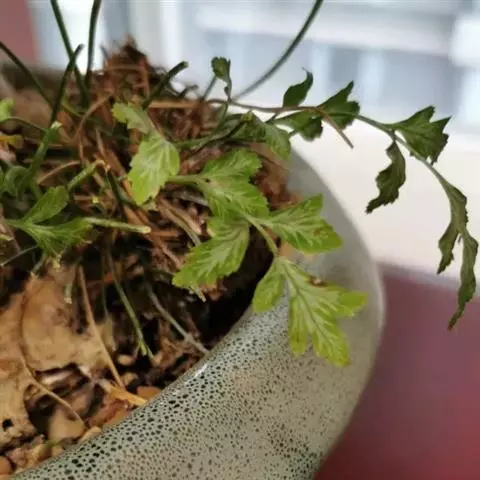营养繁殖是水蕨最简易便捷的繁殖方式。水蕨植株在老叶上常长出不定芽,即芽孢,芽孢可发育成新的植株。这些小植株具有完整的根、茎、叶,是一个完整的植株。长到3-4片叶时,可将其剪下用普通、不渗水的容器如水杯进行培养。在水杯底部垫置一层淤泥,将根部埋入泥中,然后向水杯中注入一层浅水即可。为使植株生长迅速,可施用少量化肥促其生长。