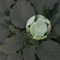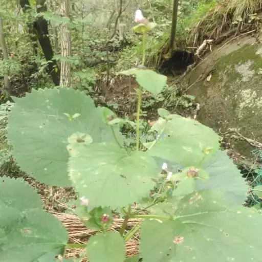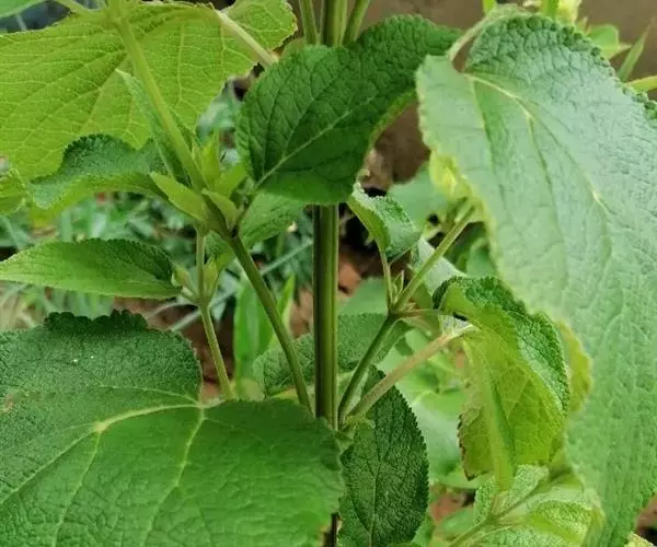 叶近圆形、圆卵形至卵状长圆形,长5.2-12厘米,宽2.5-12厘米,先端急尖,稀渐尖,基部浅心形或圆形,边缘为具胼胝尖的锯齿状牙齿,或为不整齐的圆齿,上面橄榄绿色,疏被疏柔毛及星状疏柔毛,下面较淡,毛被同叶上面,但有时较密,叶柄长1-12厘米,腹凹背凸,密被短硬毛;苞叶通常为卵形,长1-3.5厘米,宽0.6-2厘米,边缘为粗锯齿状牙齿,毛被同茎叶,叶柄长2-3毫米。