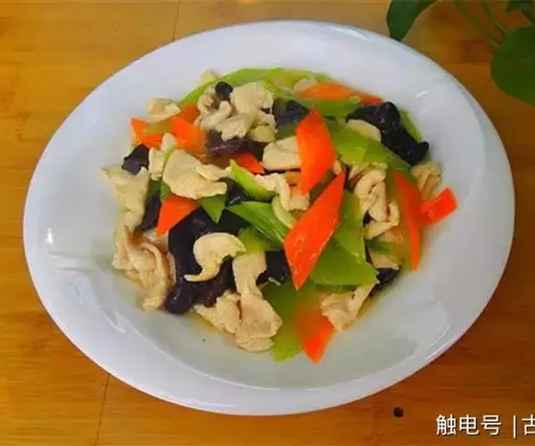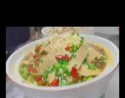 4、最后把制作好的配菜放入米豆腐之上,如:木耳肉丝、青椒瘦肉等。吃的时候用勺稍拌一下,其味更匀、色更佳。